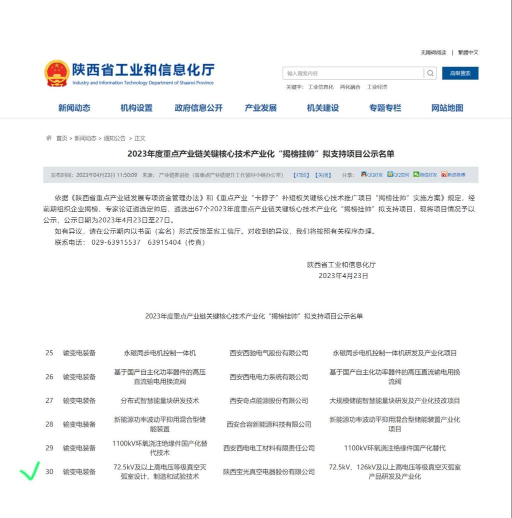 通過認真籌備、資料審核及現(xiàn)場答辯,由公司組織申報的“72.5kV、126kV及以上高電壓等級真空滅弧室產(chǎn)品研發(fā)及產(chǎn)業(yè)化”項目與“高鐵車載開關用真空滅弧室智能化產(chǎn)線建設”項目分別中榜陜西省工信廳2023年關鍵核心技術產(chǎn)業(yè)化“揭榜掛帥”項目與重點產(chǎn)業(yè)鏈發(fā)展項目,并已進入公示階段。
